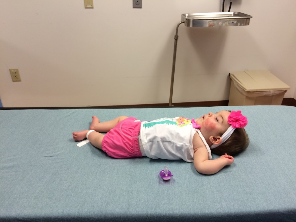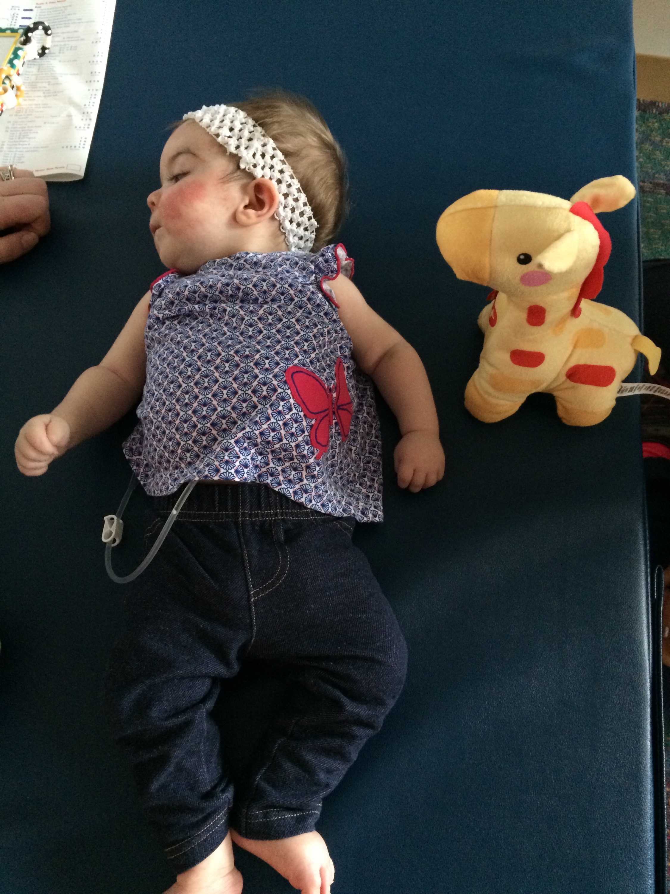 Her clinic visit started with a physical therapy and speech language pathology assessment. Tori did not like that very much. She did some tummy time for the first time in a long time but didn’t hate it as much as she used to.
