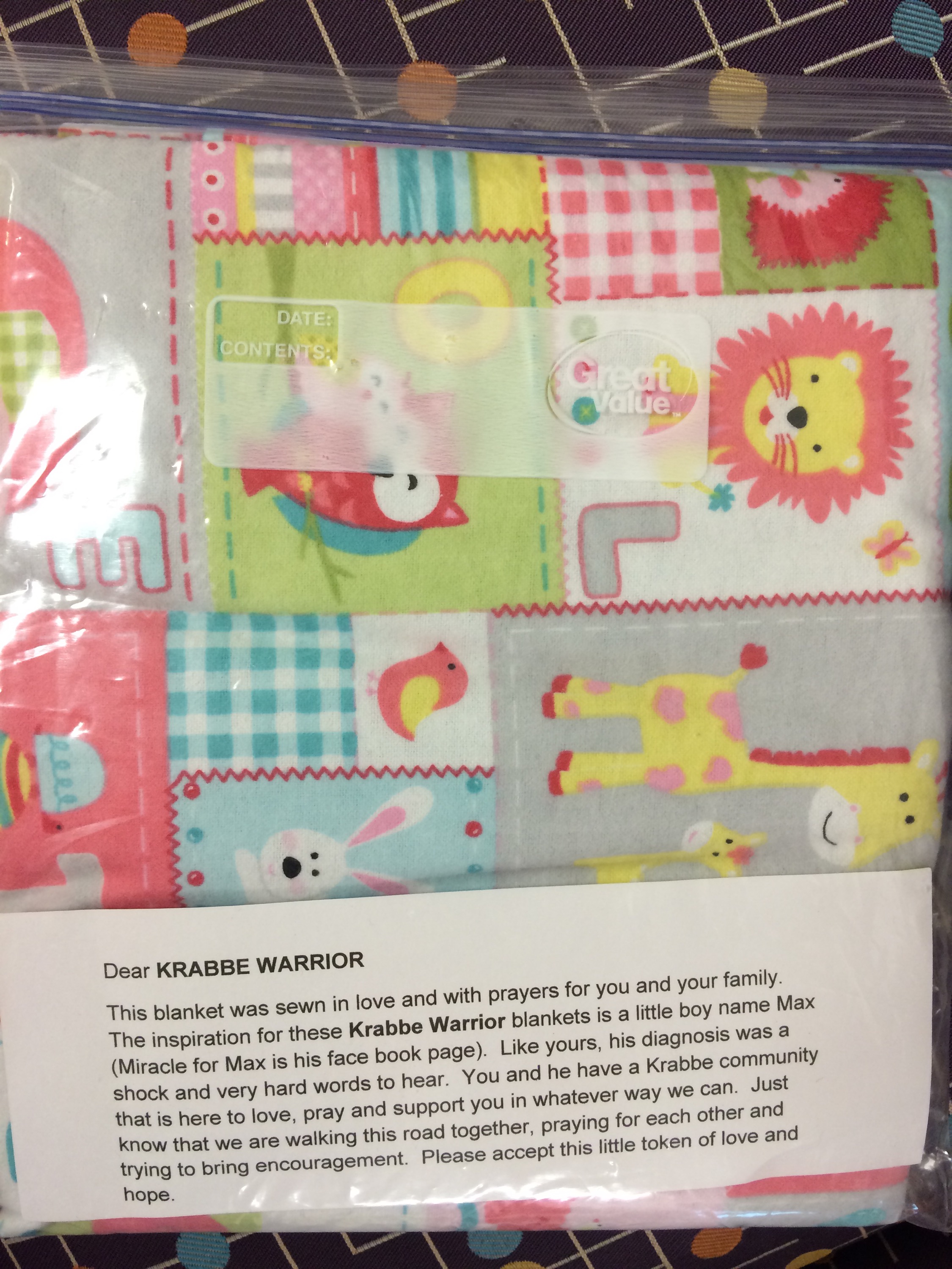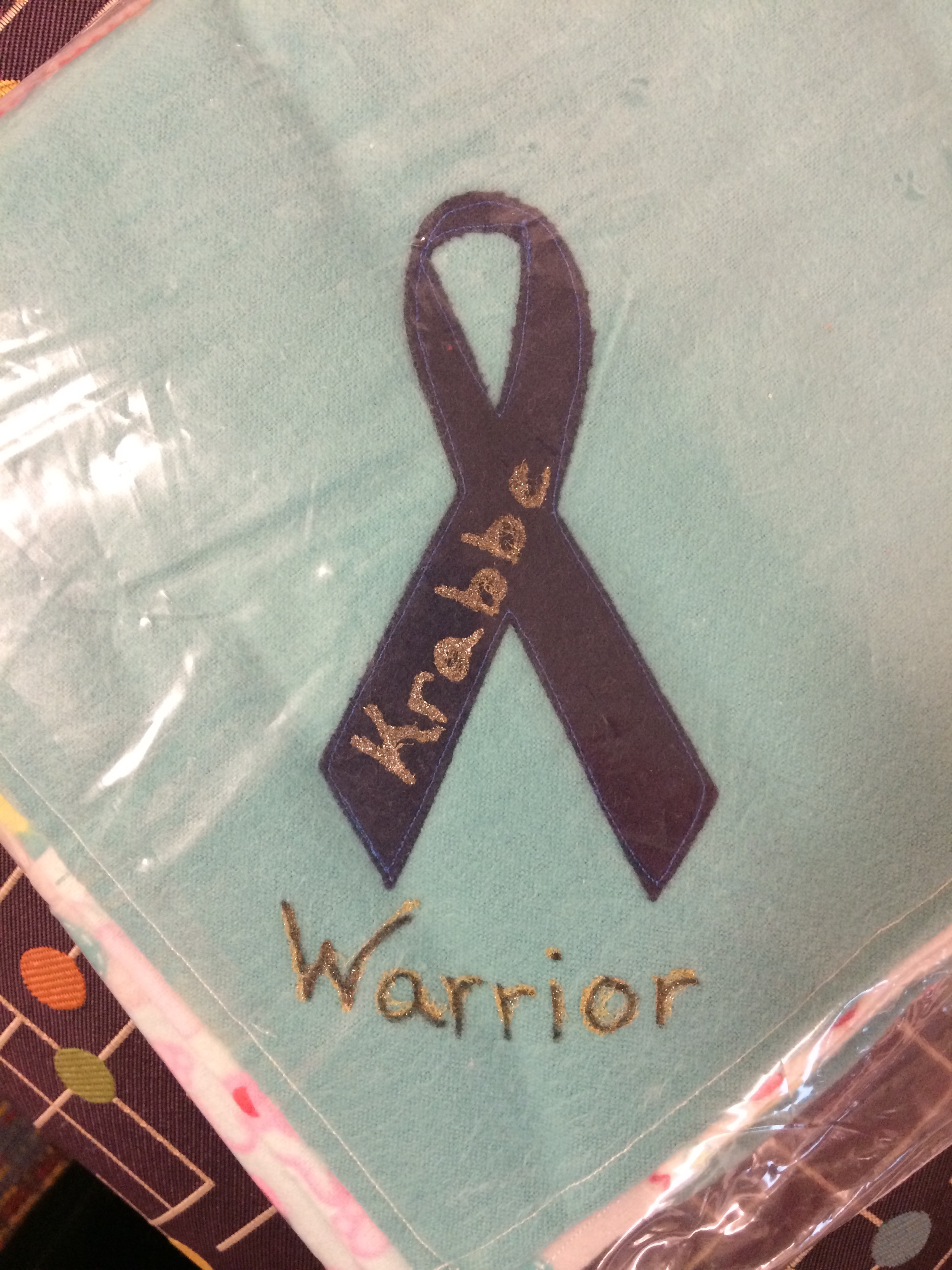 We were also given a blanket that friends of another Krabbe family made for patients to have. Tori’s has a giraffe on it.