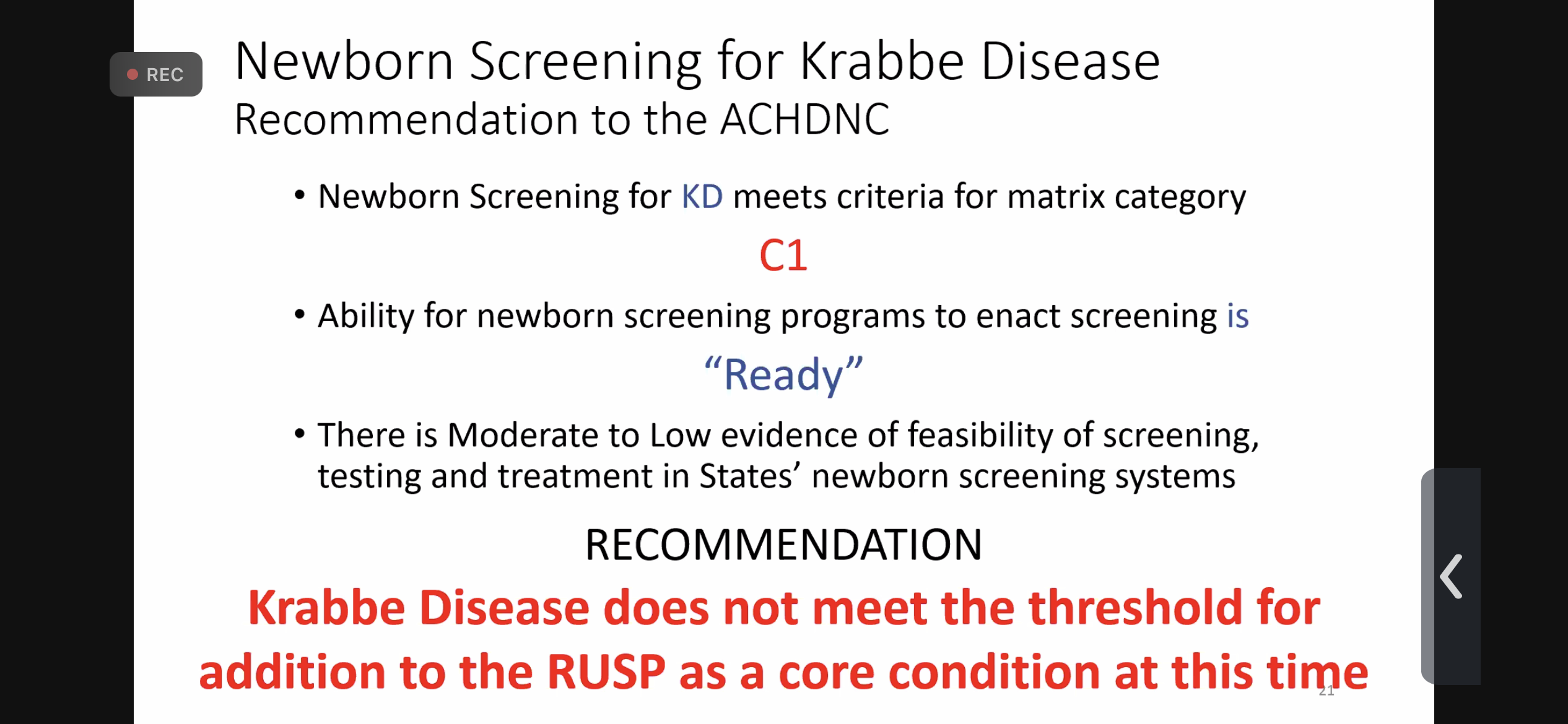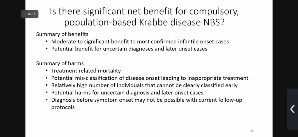 - One of the committee members published a paper in 2013 against screening for Krabbe Disease and I believe she should not have been allowed to vote (spoiler alert: she voted no) though I had hoped she would have changed her mind given the tremendous advances that have happened in ten years.