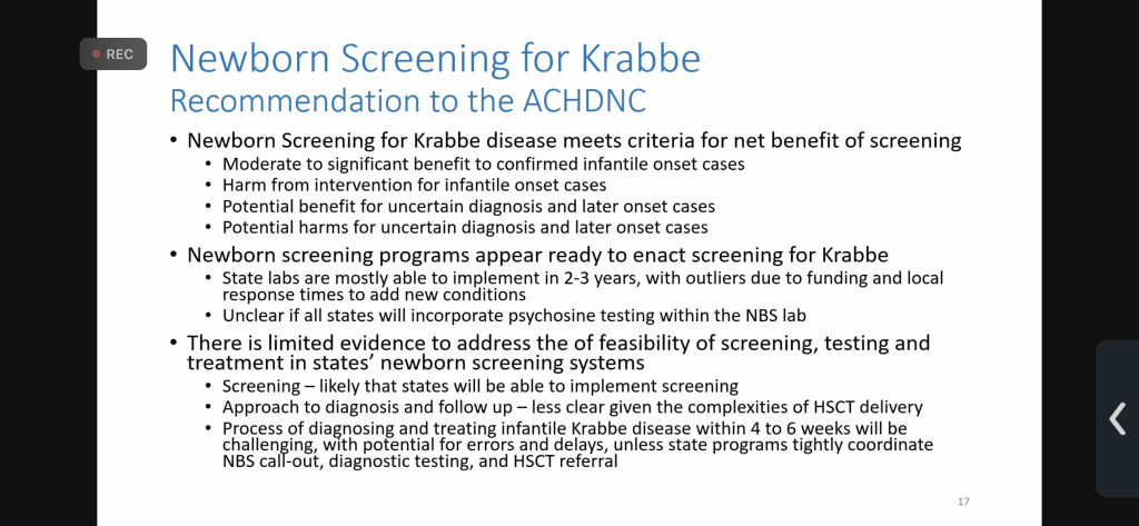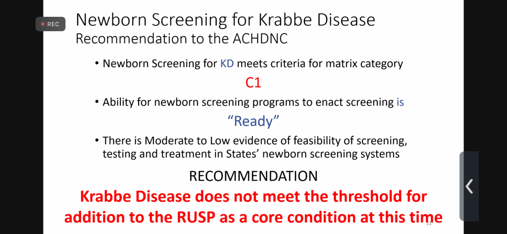 Another frustrating comment made was regarding patient outcomes when there is a family history (i.e. when a child has already had the disease and/or died) versus Newborn Screening and the assertion was made that the outcomes are better (which isn’t backed up by data). What I took from that part of the discussion was that they were actually considering whether or not it was better for the family to lose a child in order to save another rather than recommend that all states screen for Krabbe. Whether that’s what they meant or not is uncertain, but it was noted.