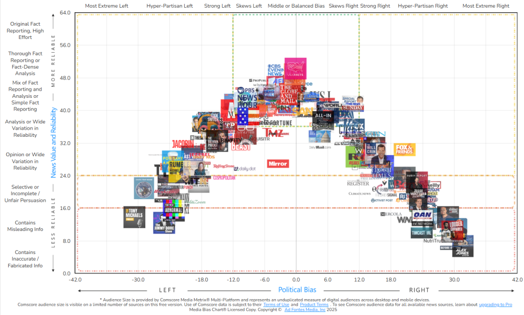 - Ad Fontes Media has a fantastic chart that shows both trustworthiness and how a source leans – try to stay with sources in the center.
