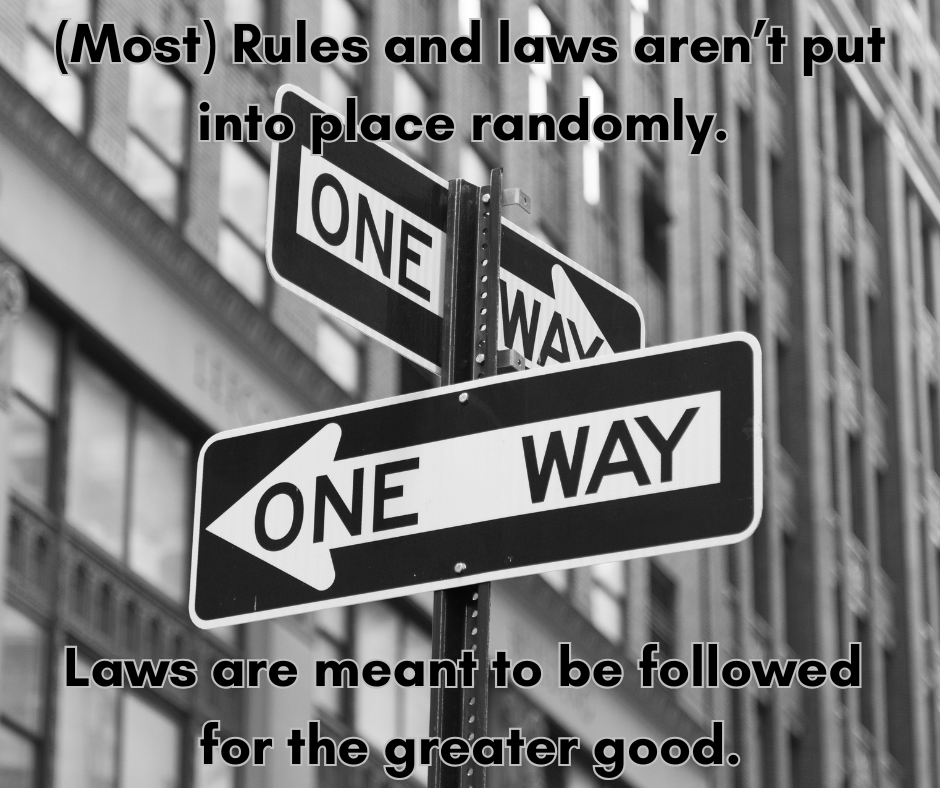 Laws and rules GIVE US FREEDOM. They give us life (or allow us to keep it). They establish order which provides us all with safety and happiness. Laws matter.