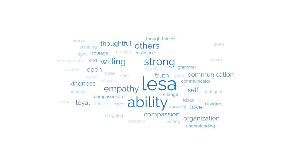 “Lesa has so much grace in the face of opposition. When people are hurtful towards her, she maintains a position of love towards them, even if it involves removing herself, or them, from the situation. Lesa is able to state her opinion on controversial subjects clearly and back them up with facts. When others disagree and point out facts that contradict the ones Lesa has presented, she is able to listen to understand their point of view. It may not change her opinion, but she is willing and eager to understand where others are coming from.”